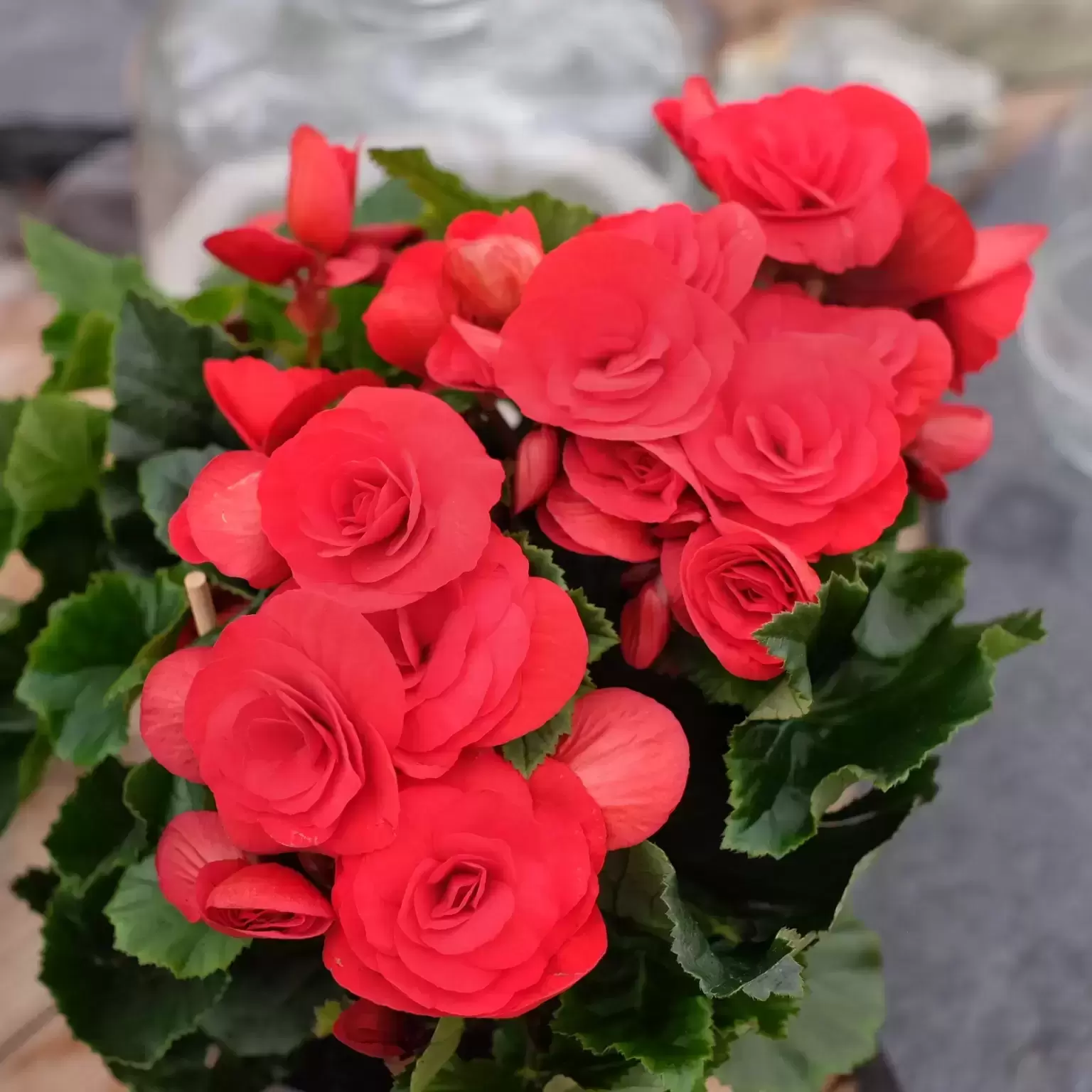 Attractive dark green foliage with bright double red flowers. Enjoys humidity, so ideal plant for bathrooms and kitchens.