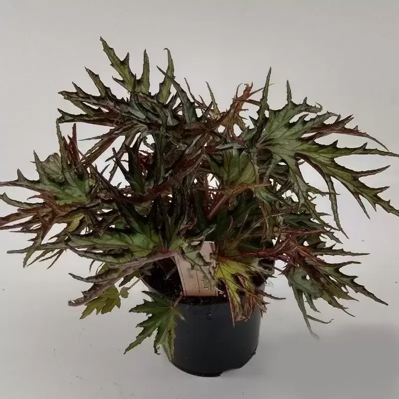 Heavily serrated, fan shaped foliage in dark green with red and bronze veining. Enjoys humidity, so ideal plant for bathrooms and kitchens.