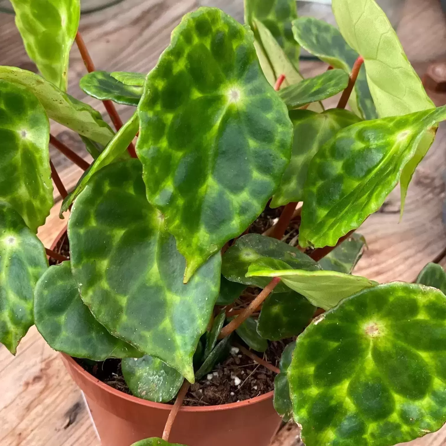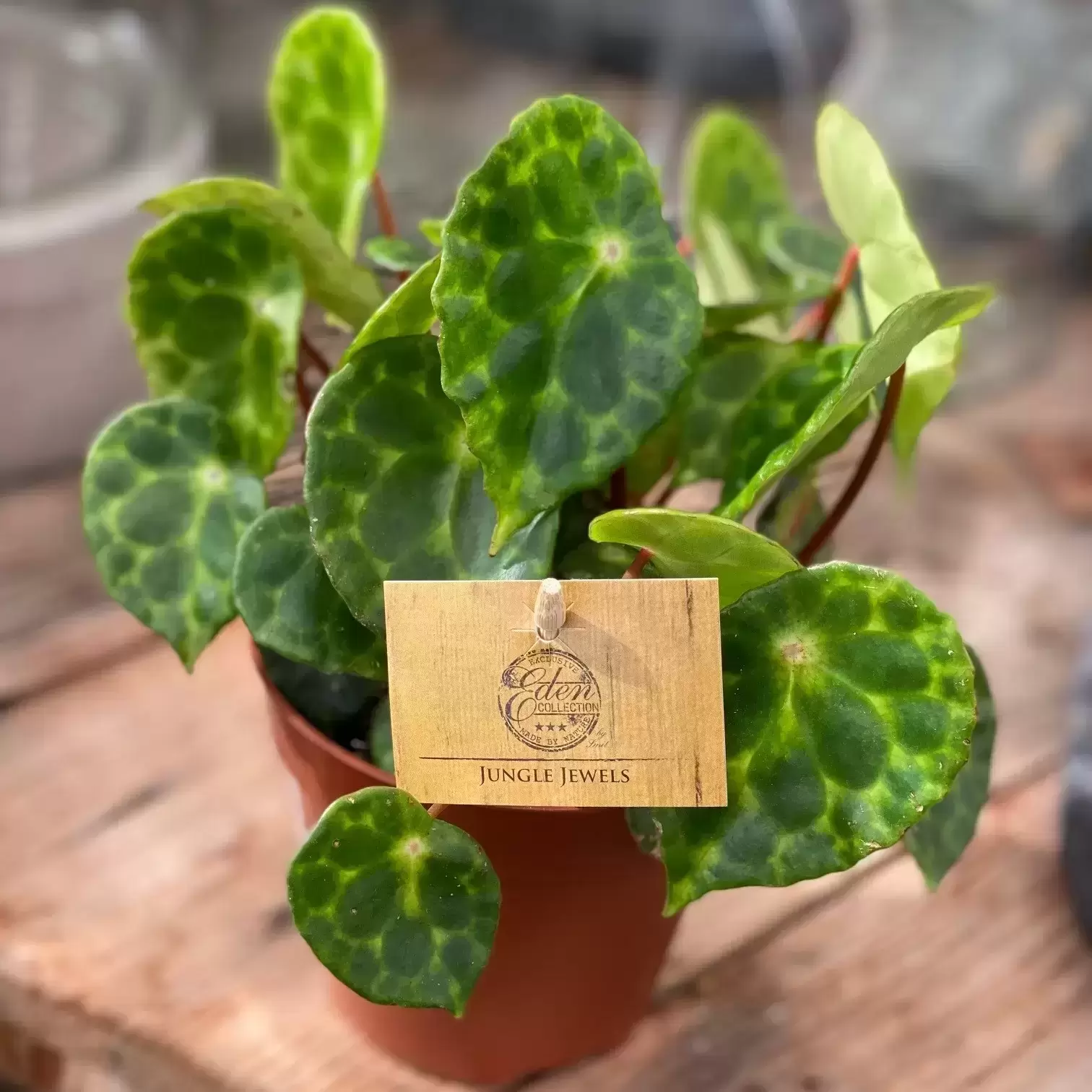 Interesting dappled green leaves with bright red stems. Enjoys humidity, so ideal plant for bathrooms and kitchens.