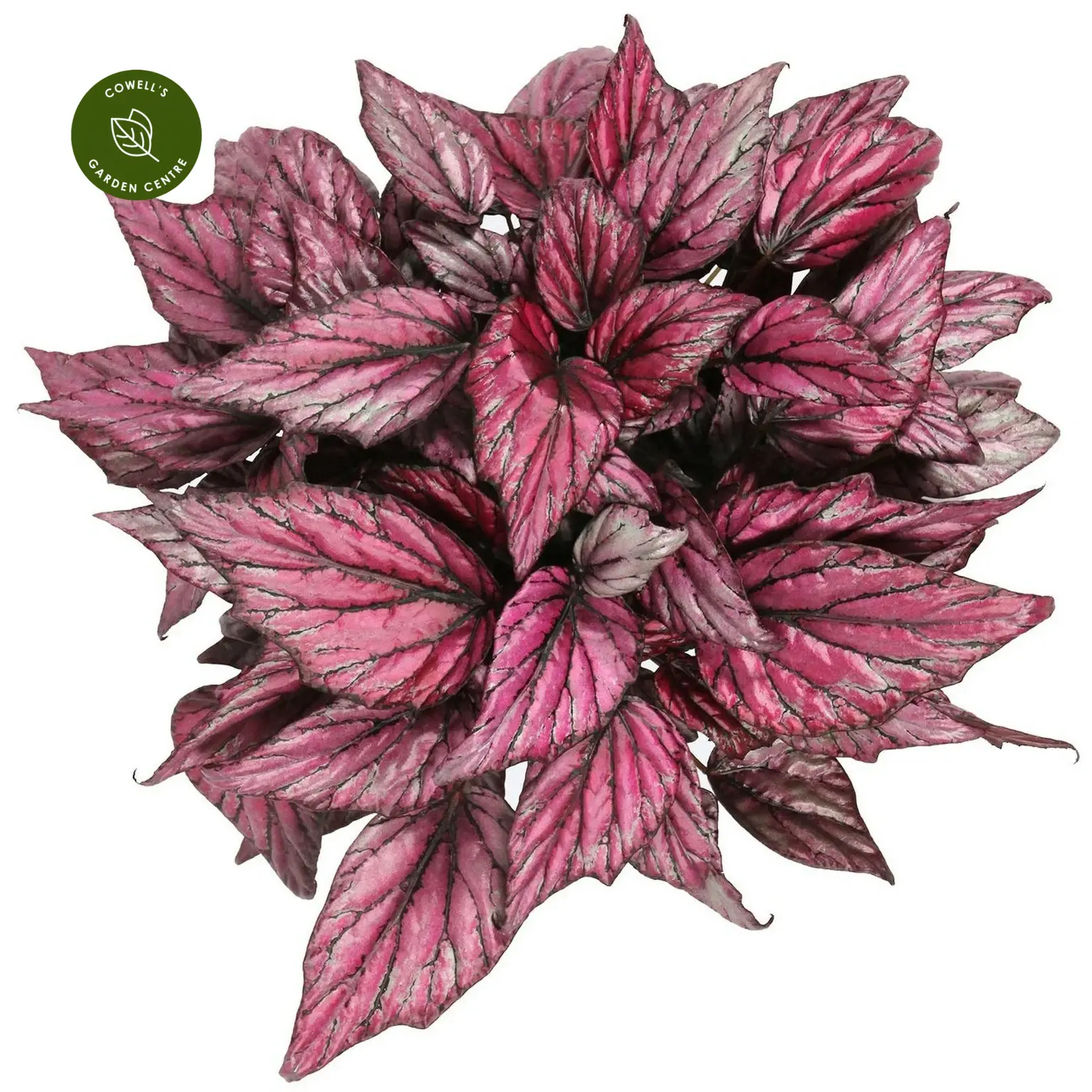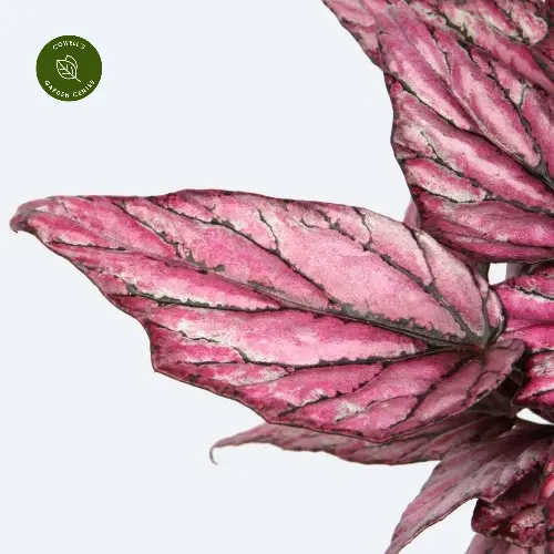Large, oval leaves coloured metallic pink with attractive silver marking. Enjoys humidity, so ideal plant for bathrooms and kitchens.