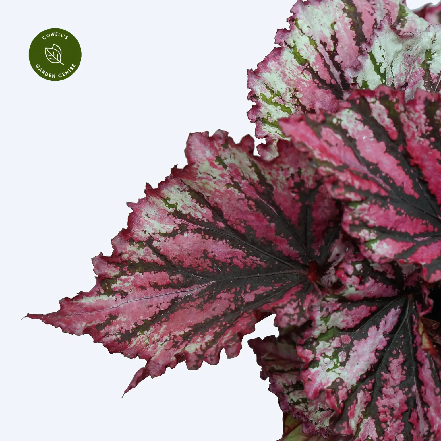 Iridescent silvery pinks leaves with a dark veining, and pale pink flowers in spring. Enjoys humidity, so ideal plant for bathrooms and kitchens.