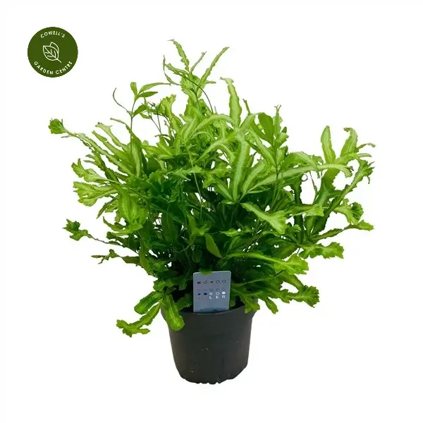 Delicate fern with long fronds of variegated green and cream leaves.Â